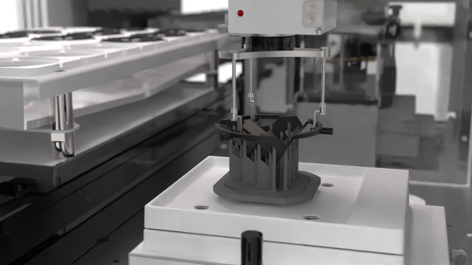 Dimensionics Density’s density determination process uses the time-worn Archimedes principle but in combination with modern automation technology, therefore squeezing every last bit of accuracy out of this method. The samples to be measured are placed in a special component carrier, which is provided with openings on the underside. These component carriers are transported through the system by an axis robot and lowered centrally and precisely onto the scales. On the scales themselves is a lift-out rack with pins that lifts the component over the openings in the component carrier and thus lifts the component out of the carrier. The automated handling eliminates human influence on the measurement, as the parts are always placed identically onto the scales.